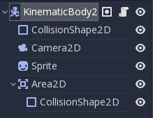 The Area2D object has a CollisionShape2D node as a child node. This serves as an area around your character where you would want to handle some type of event or check some type of collision. For example, if you walk into an enemy and collide, the CollisionShape2D object of the KinematicBody2D will prevent you from walking through the enemy but what would make you decide if you need to respawn or not? This is where the Area2D comes in. You can check all objects within the Area2D and trigger some function or method to handle the event needed.
