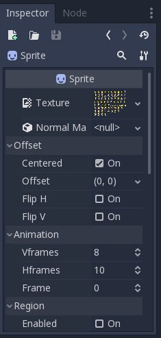 Once you click on your Sprite node you will see a few options underneath your scene. These will display under the ‘Inspector’ tab. Here you will see a Texture option where you can drag and drop your image (sprite) or sprite sheet. Under the ‘Animation’ section you will see the options’ Vframes’, ‘Hframes’ and Frame. ‘Vframes’ is used to specify how many vertical images can be contained in your sprite sheet whereas ‘Hframes’ is to specify the number of horizontal images. The ‘Frame’ option can be cycled to see all images inside the sprite sheet and identify which images are assigned to which frame number.