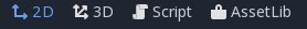 If you open Godot you will see 4 view options in the middle on the top of your screen. These options are 2D, 3D, Script and AssetLib. The one highlighted in blue is your current selected view. For our 2D game, we will only be using the 2d view and the Script view.