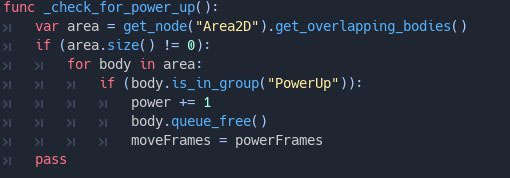 The above screenshot shows how I used the Area2D object to determine if my character has picked up a power-up. The get_overlapping_bodies() method call returns a list of crossing PhysicsBody2Ds, which we can then use to look through all objects in the Area2D and decide how we would like to handle them. In this case, if the object is a power-up then we will increase the character's power by one and destroy the power-up with the queue_free() method. The safest way to delete a node is by using the queue_free() method. This erases the node safely during idle. This will release the resources hogged by the power-up object as well. When a node is freed, it also frees all its children nodes. Because of this, manually deleting nodes is much simpler than it seems. Free the base node, and everything else in the subtree goes away with it. Be careful to create many game objects and move them out of the screen but not freeing the resources they have used. This can dramatically affect your game performance.