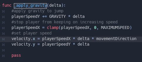 The clamp function call in the screenshot above is used to lock the value of something. I have done this on the playerSpeedX variable and I have used the MAXIMUMSPEED constant variable as the measure I would like to clamp it by. This means my characters speed will gradually increase as I hold down my arrow buttons to move left and right, but it won’t move faster than my max speed I have specified. This is useful for controlling and limiting certain values.]