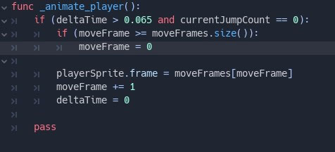 We will need to know which frames in our sprite sheet we will need to use for animating our character. In this case the move frames are [60, 61, 62, 63, 64, 65, 66, 67]. This is then assigned to a variable called moveFrames. You will see an if statement where I check that the current moveFrame is not greater than the amount of move frames we have, and if it is I will reset our current move frame back to the first move frame which is 0 (Remember arrays start at 0 and not 1).