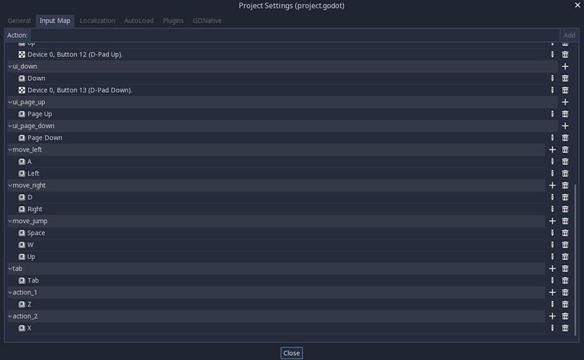 Looking at our _jump() method we check Input.is_action_just_pressed(“move_jump”). This is a build in function that Godot offers us for checking if a button is pressed. On the Input Map screenshot above, where we define our key mappings, we would then need to define a new mapping called move_jump and assign a key to this mapping. I have assigned ‘space’, ‘up arrow’ and ‘w’ for my jumping action. This way players can choose their preference and play the game with whichever they are more comfortable with.
